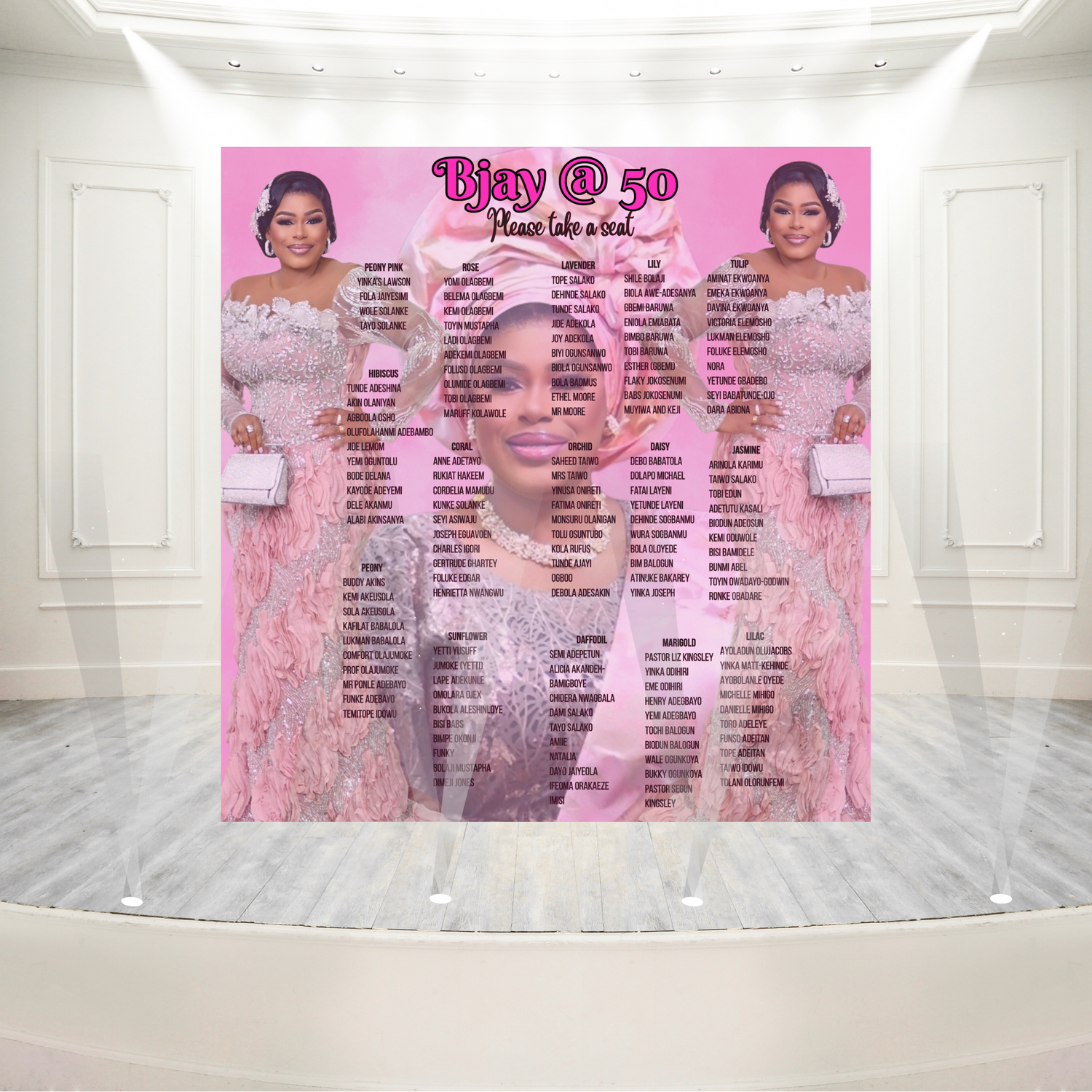 Make your guest list a work of art. Custom seating chart backdrops featuring stunning photography and elegant typography. Perfect for milestone birthdays, weddings, and VIP celebrations