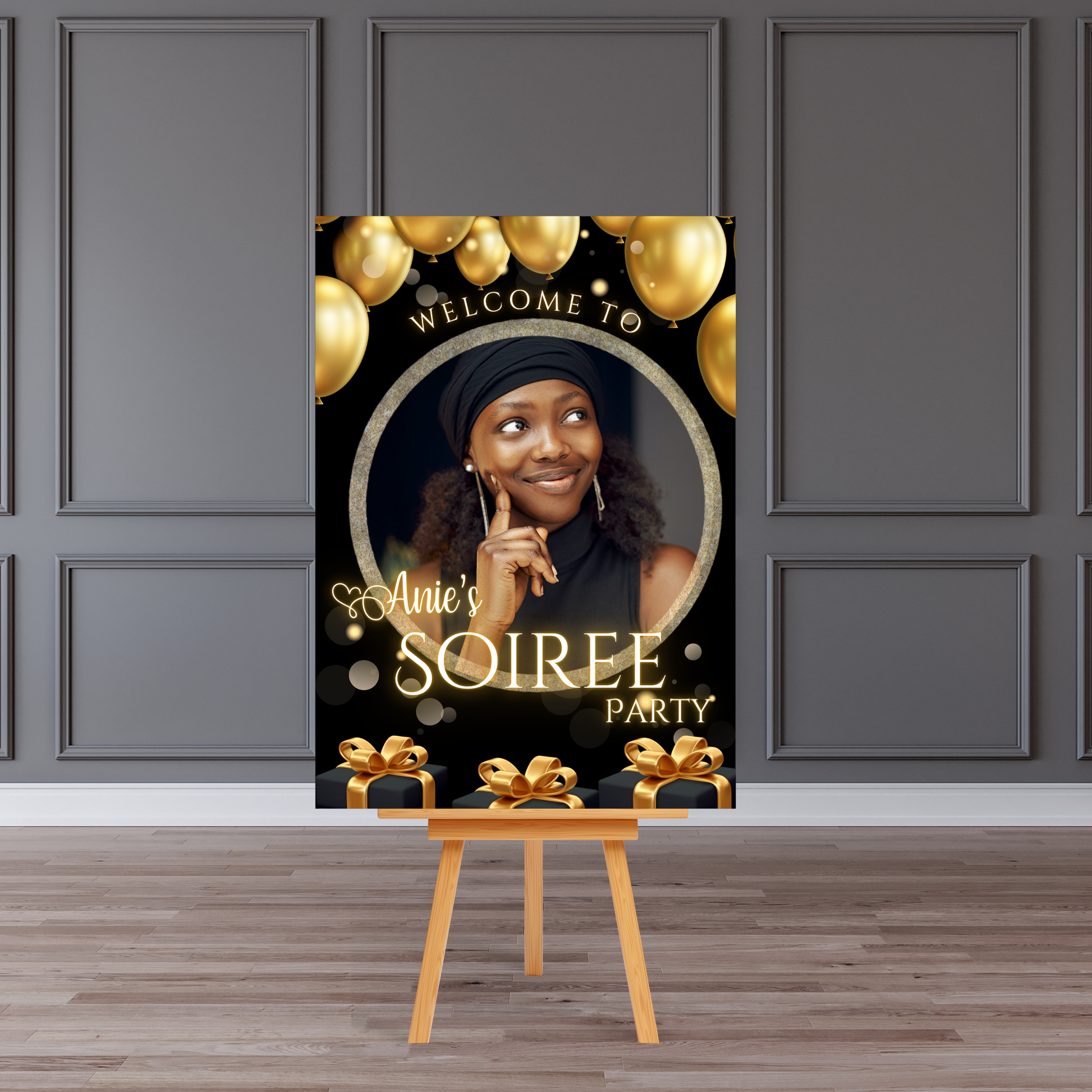 Welcome guests in luxe style with this personalised birthday soirée welcome board, featuring a black-and-gold balloon design with a custom photo centrepiece. Add the celebrant’s name and party details, and we’ll professionally print a premium entrance sign that doubles as a beautiful keepsake.